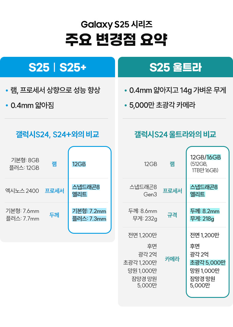 각 모델은 이전 모델인 S24 시리즈에 비해 성능과 디자인에서 많은 개선이 이루어졌습니다. 특히, S25 Ultra는 카메라 성능이 크게 향상되어, 사진 촬영에 있어 더욱 뛰어난 결과물을 제공합니다.