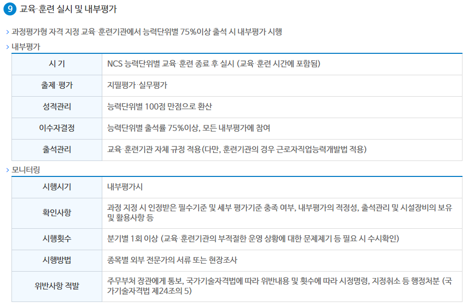 | 합격기준 | 100점을 만점으로 60점이상 | 내부평가와 외부평가 결과를 1:1로 반영하여 평균 80점 이상 |