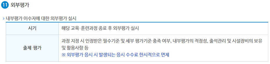 | 평가방법 | 필기 시험 / 실기 시험 | 내부 평가 / 외부 평가 |