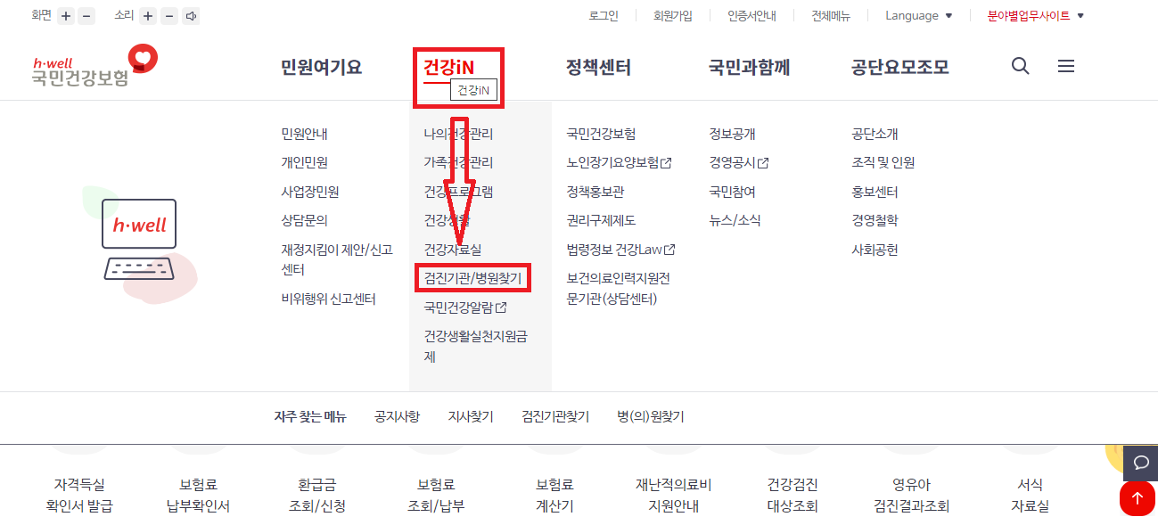 2. 상단 메뉴에서 건강 in --> 검진기관/병원 찾기 클릭합니다.
