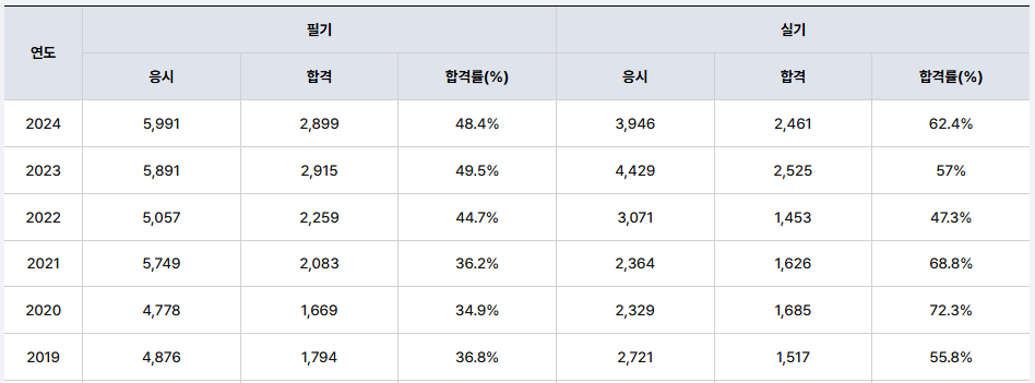 2024년 필기시험 합격률: 48.4%(응시자 5,991명, 합격자 2,899명)
