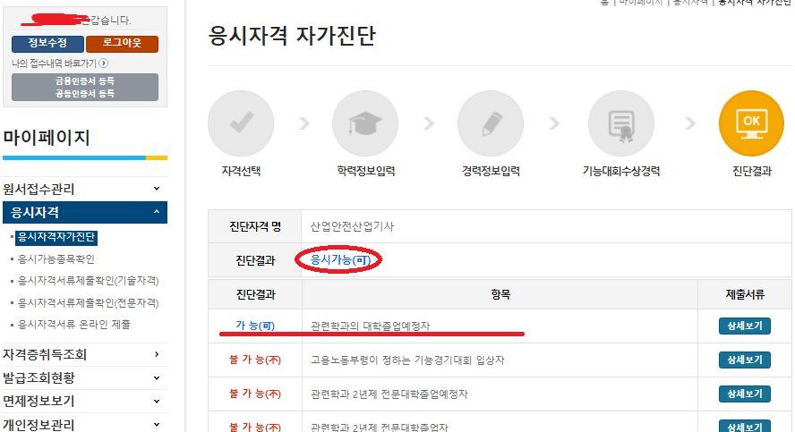 - 홈페이지 접속 -> 로그인 -> 마이페이지 -> 왼쪽 사이드바 응시자격 -> 응시자격자가진단 - > 자격검색 -> 진단하기 클릭