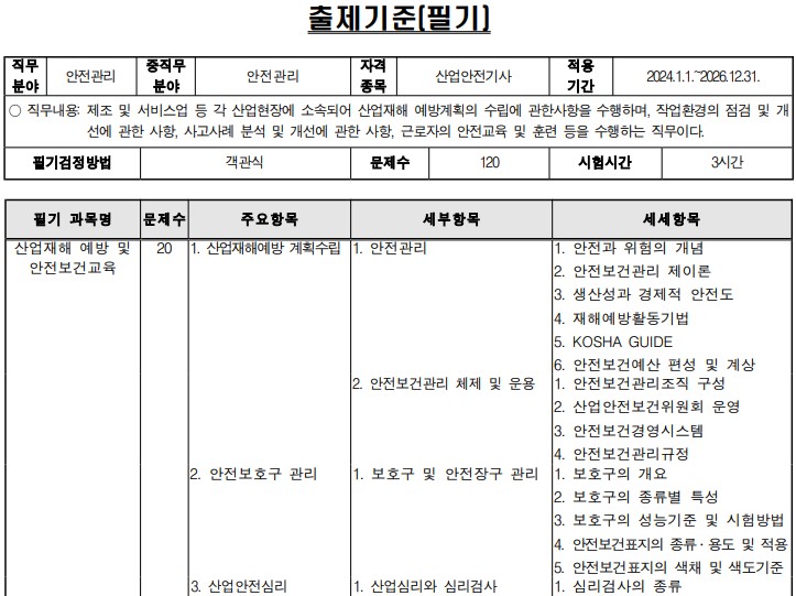 - 필기 : 안전관리론, 인간공학 및 시스템안전공학, 기계위험방지기술, 전기위험방지기술, 화학설비위험방지기술, 건설안전기술 (객관식 4지 택일형 과목당 20문항 30분)