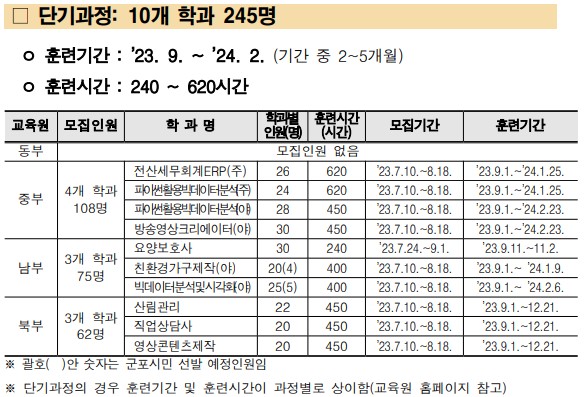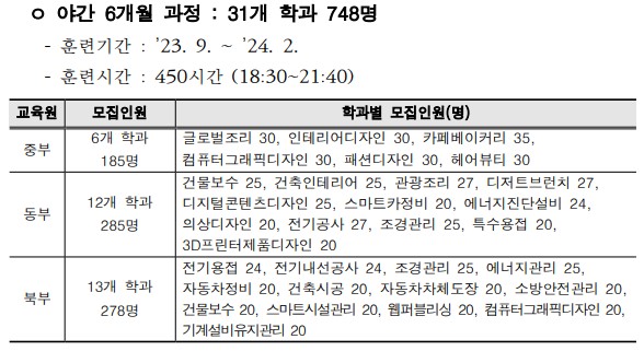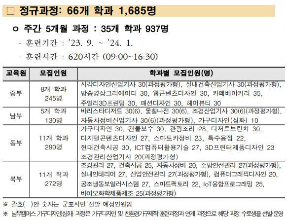 | 과정별 | 정규과정 : 66개 학과 1,685명 - 주간 5개월 : 35개학과 937명 - 야간 6개월 : 31개 학과 748명 |