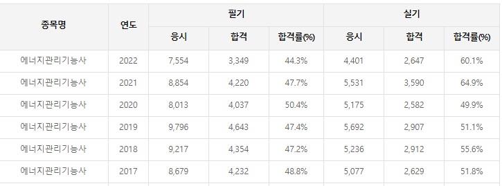 위 통계표를 보면 필기합격률은 평균적으로 46%대를 보이고 실기합격률은 최근 2년을 보면 60%를 보이고 있습니다. 즉 필기시험합격의 합격률이 조금 더 낮기 때문에 시험대비는 필기시험을 위주로 하시면 좋은 결과가 있을 것 같습니다.