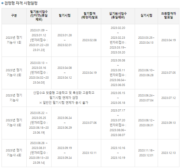 위사진과 같이 시험은 1년에 4회 진행됩니다. 중간에 한번 특성화 고등학생들의 위한 시험은 일반인분들에게는 제외됩니다. 매년 시험이 이루어지는 일정은 비슷한 시기이기 때문에 내년을 준비하시는 분들도 참고하시면 좋겠습니다.