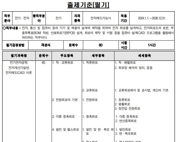 필기 : 전기전자공학, 전자계산기일반, 전자제도(CAD) 이론 (객관식 4지 택일형 60문항 60분)