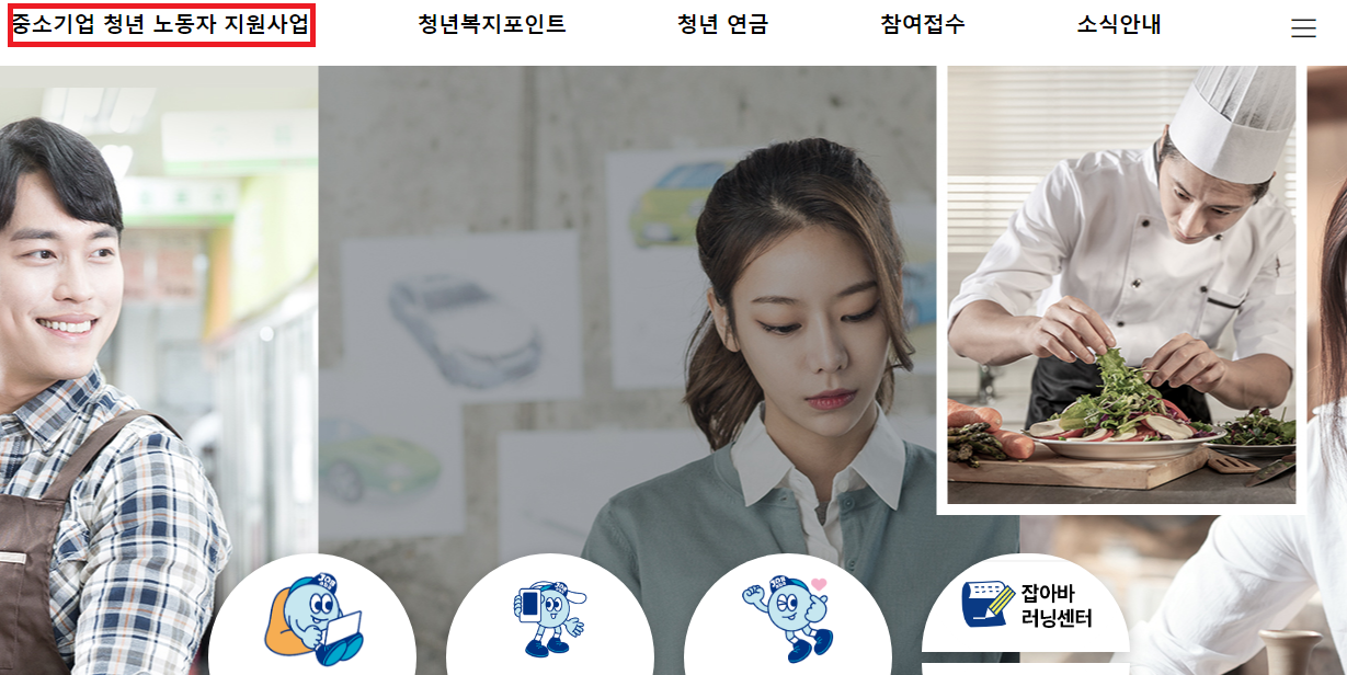 1. 홈페이지 접속하여 중소기업 청년 노동자 지원사업 클릭