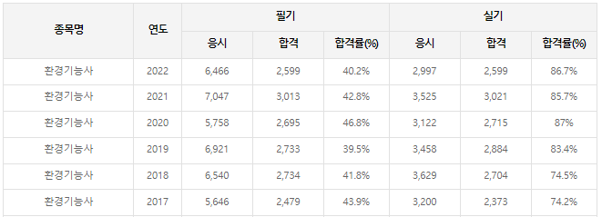 기능사 합격률은 위 표와 같이 필기시험은 40%대를 나타내고 실기시험은 85%대를 나타냅니다. 그만 큰 필기시험의 합격률이 중요하다고 볼 수 있기 때문에 시험대비는 필기시험에 추첨을 더 두시는 것이 좋겠습니다.