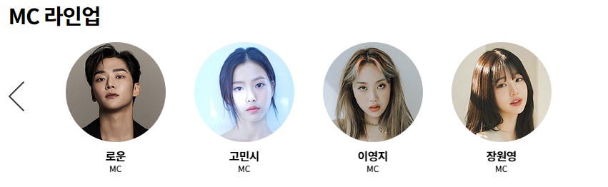 먼저 메인 MC는 1차 공연은 로운, 장원영이 진행을 하게 되고 , 2차 공연은 로운, 고민시, 이영지가 진행을 맡았습니다.