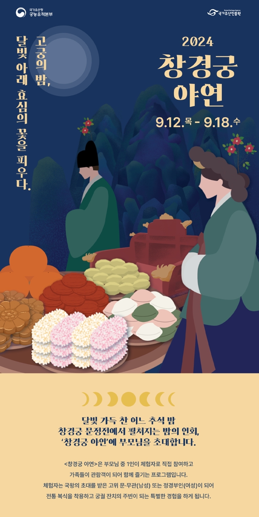 창경궁 야연은 문정전에서 펼쳐지는 밤의 연회입니다. 부모님 중 1인이 체험자로 직접 참여하고 가족들이 관람객이 되어 함께 즐기는 프로그램입니다. 국왕의 초대를 받은 고위 문/무관(남성) 또는 정경부인(여성)이 되어 전통 복식을 착용하고 궁궐 잔치의 주빈이 되는 특별한 경험을 하게 됩니다.