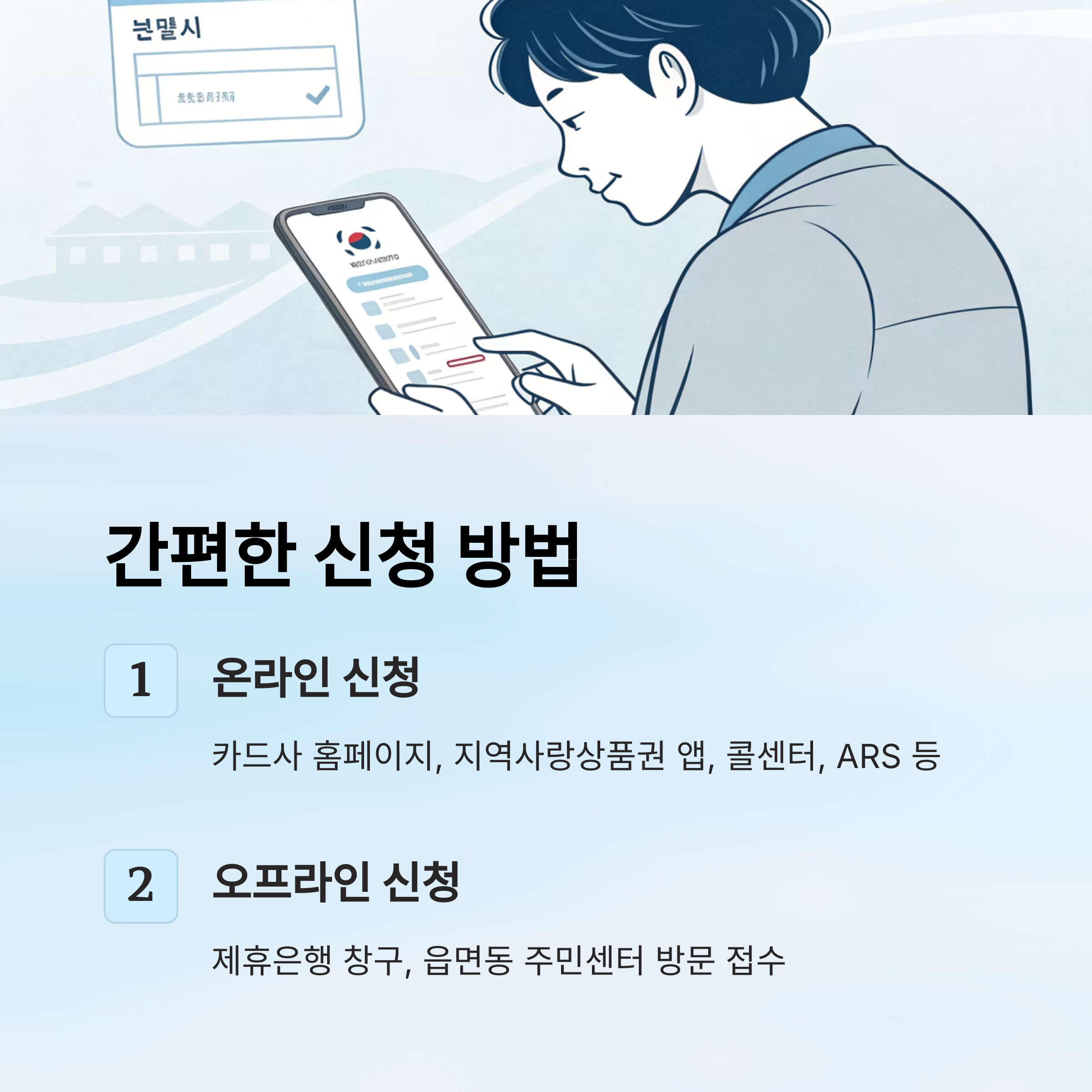 신청 방법은 온라인 오프라인 모두 가능합니다. 주요 카드사 및 상품권 플랫폼에서 간편하게 신청 가능하며 온라인이 어려운 경우 주민센터 방문 신청도 가능합니다.